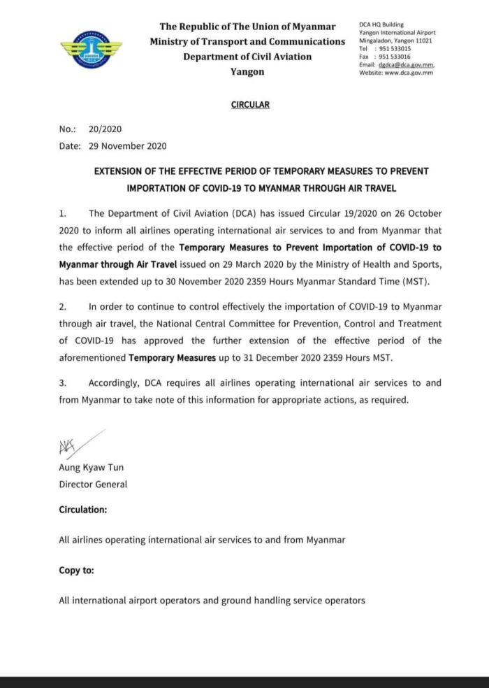 [애드쇼파르] 미얀마 보건체육부는 현재 유지되고 있는 각종 코로나19 제재조치가 2020년12월15일까지 연장과 함께 미얀마 항공국은 미얀마 국제선 여객기 입국금지 조치를 2020년12월31일까지 연장 발표를 하였다.