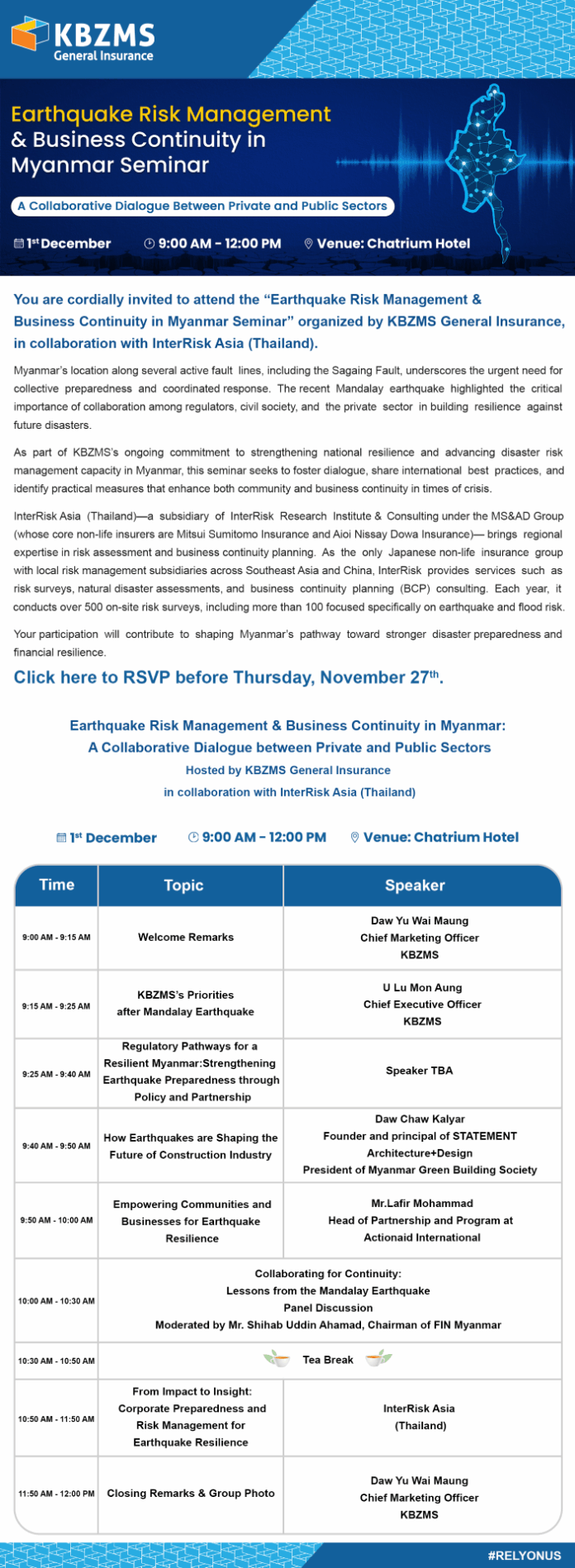 [애드쇼파르] 2025년 12월 1일, 양곤 Chatrium Hotel에서 KBZMS General Insurance가 InterRisk Asia (Thailand)와 협력하여 지진 위기 관리 및 미얀마 사업 지속가능성에 대한 세미나를 개최한다.