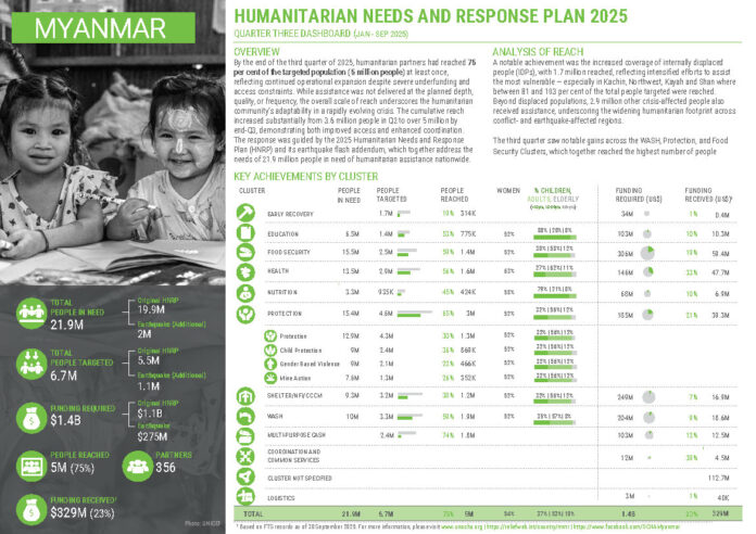 [애드쇼파르] 유엔 인도주의 업무 조정 사무소는 2025년 9월말까지 미얀마에서 UN과 국제 인도적 파트너들은 2025년 Humanitarian Needs and Response Plan(HNRP) 및 지진 긴급 대응 추가 계획을 바탕으로, 전국적으로 인도적 지원이 필요한 21.9백만 명 가운데 목표 인구 6.7백만 명 중 약 75%인 5백만 명에게 최소 한 차례 이상 도움을 전달하였다고 밝혔다.