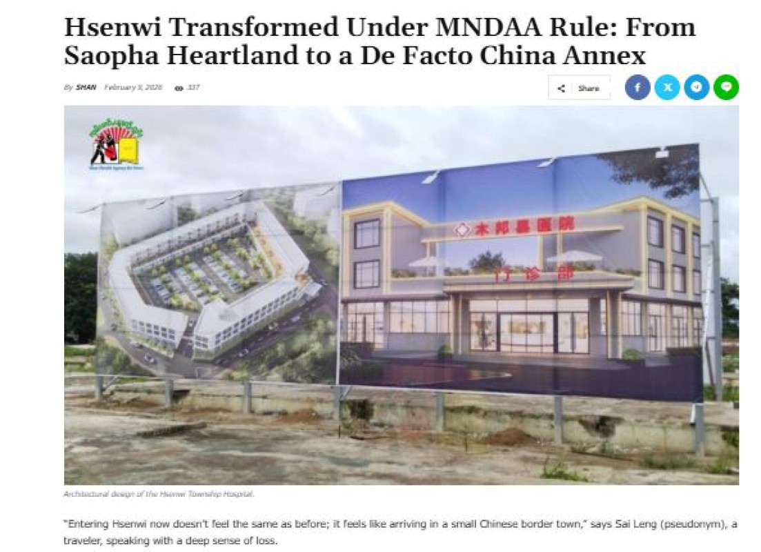 [애드쇼파르] Myanmar National Democratic Alliance Army(MNDAA)가 실질적으로 통제 중인 샨주 북부 Hseinwi 타운십에서 모든 공공 간판과 시설 이름, 심지어 장소명과 같은 상징적 건물의 표지까지 중국어로 변경되고 있다고 한다.