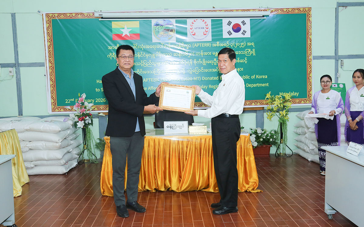[애드쇼파르] 2026년 2월 22일, 만달레이 Chanmyathazi 타운십에 위치한 지역 농업국에서, 대한민국이 ASEAN Plus Three Emergency Rice Reserve-APTERR Programme-3(2025)를 통해 기부한 1,620톤의 쌀을 만달레이 지진 피해민을 지원하기 위해 공식적으로 전달하는 행사가 개최되었다.